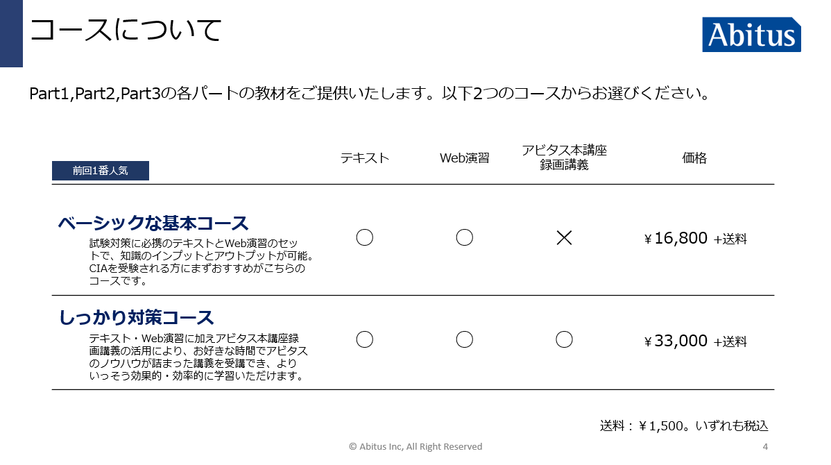 | お申込み特典 | お申込みのPartに応じて、今後実施するMUFG CIA受験対策講座(Zoomライブ配信)にご参加いただけます。 Part2